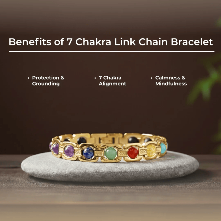 This elegant link-chain design is available in two stunning finishes: radiant Gold-Tone and sleek Polished Silver-Tone. Each bracelet is set with nine original, authentic 7 Chakra gemstones and Karungali beads, carefully selected to represent the nine celestial bodies (Grahas) in Vedic astrology. These genuine, vibrant stones are showcased in a modern yet timeless setting, creating a sophisticated accessory that is as meaningful as it is beautiful.