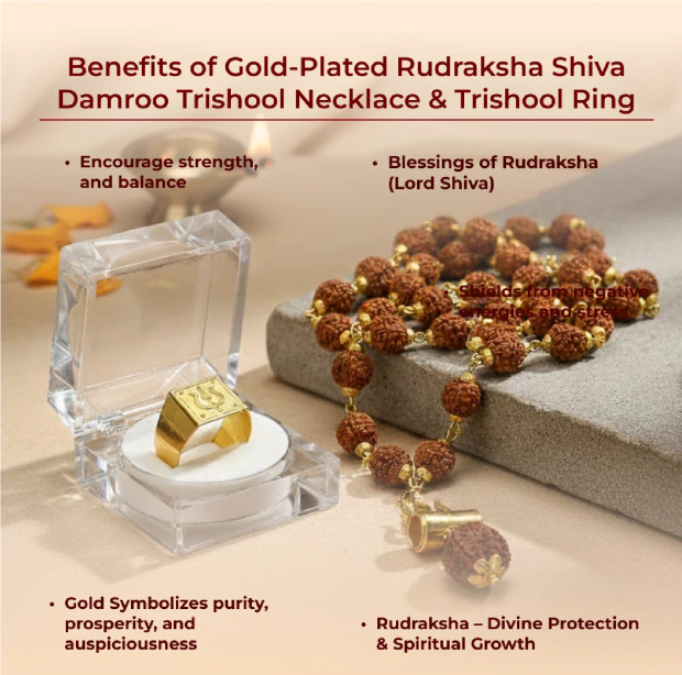Gold-Plated Rudraksha Shiva Damroo Trishool Necklace & Trishool Ring