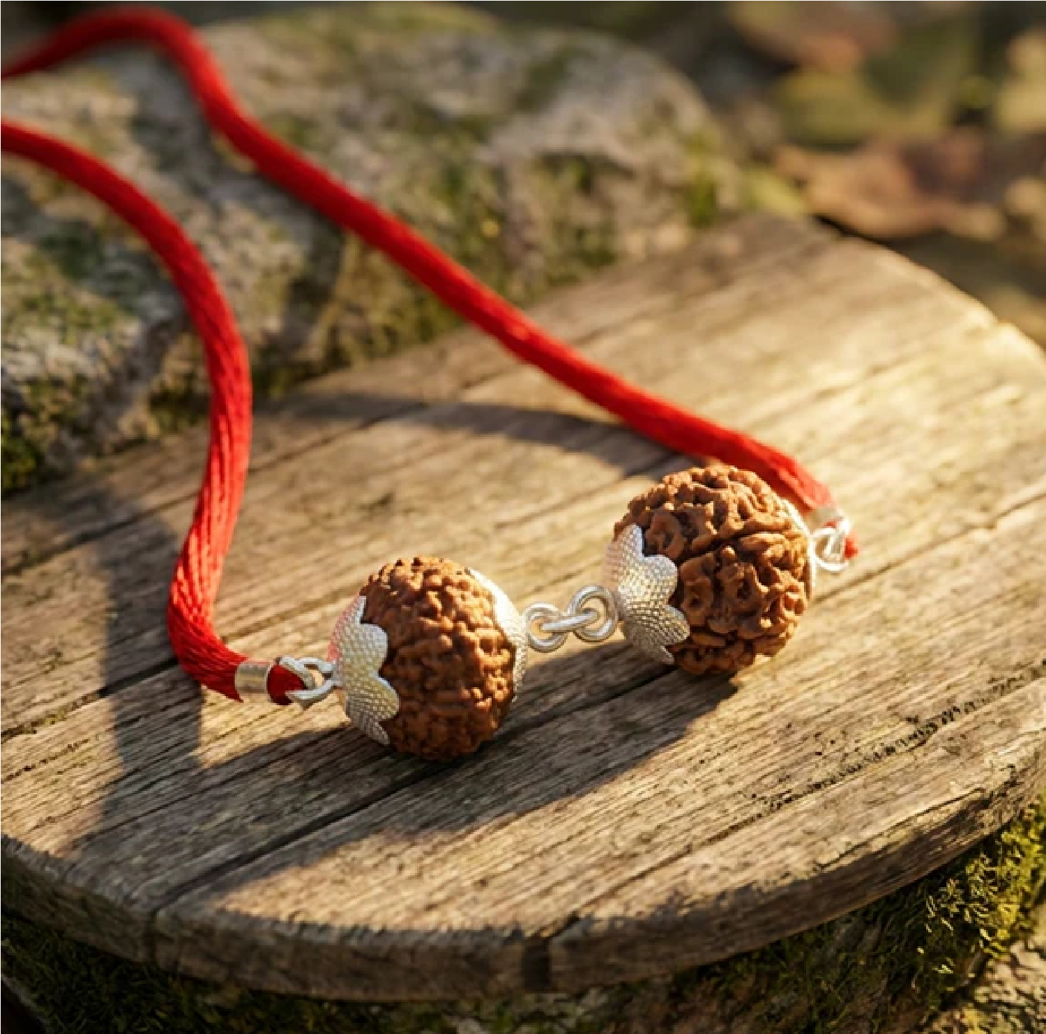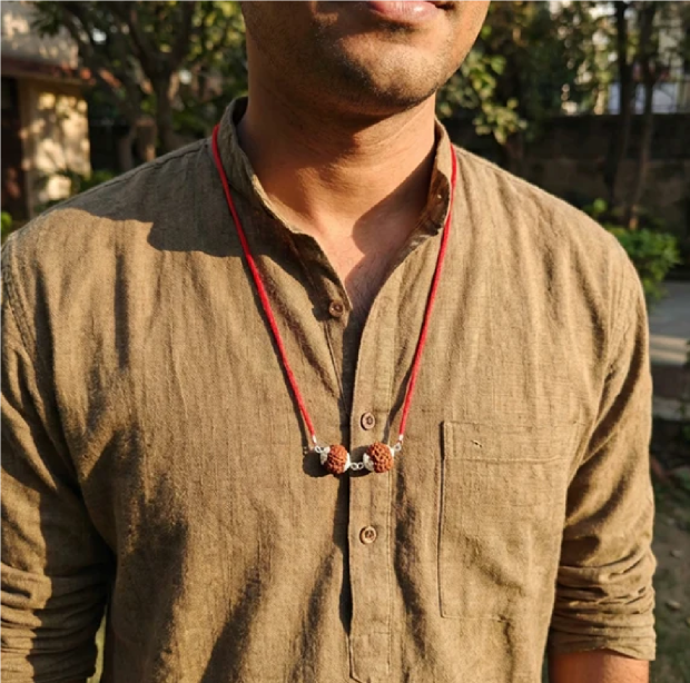 Lakshmi Narayan Kavach is made with two rudraksha one 7 Mukhi Rudraksha and one 10 Mukhi Rudraksha, both Indonesian origin. Typically, 10 Mukhi is placed at the center (Narayan/Vishnu energy) with 7 Mukhi on both sides (Lakshmi energy).