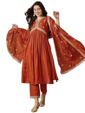 SheWill Women's Orange Vichitra Silk Alia Cut Kurta Set with Zari Sequence Chain Work, Pant & Dupatta | Kurta with Embroidery for Women
