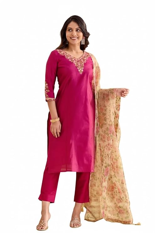 - ELEGANT DESIGN: Vibrant pink straight kurta featuring exquisite embroidery work on the neckline and sleeves, perfect for ethnic occasions and festive celebrations