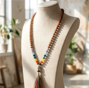 The combination of sacred Rudraksha beads and colorful chakra crystals helps align the body, mind, and spirit while adding a meaningful and elegant touch to your look.