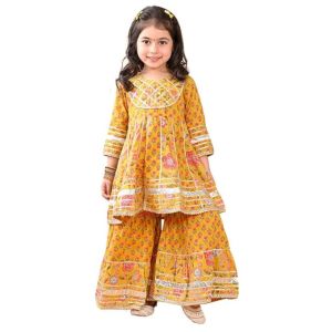 Girls Cotton Floral Printed Gotta Work 3/4 Sleeves Flared Design Kurti & Sharara Set