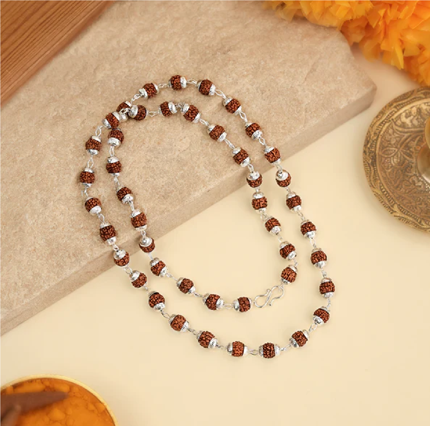 Exquisite Silver Capping: Each sacred bead is delicately encased in premium silver-finished floral caps. This not only enhances the aesthetic appeal but also ensures the longevity and structural integrity of the mala.